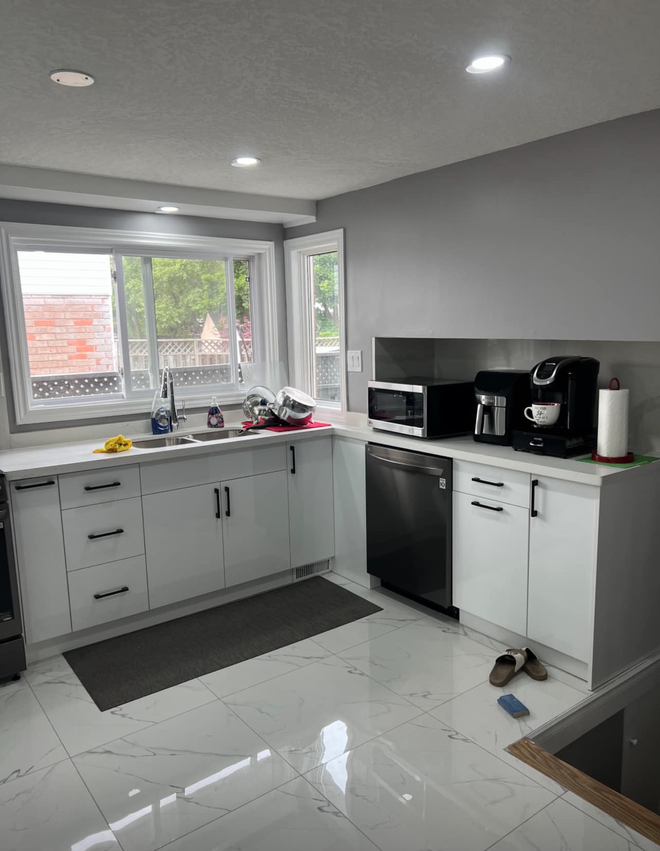 Installation of recessed pot lights, under-cabinet task lighting, and statement pendant lights to create layers of ambiance.