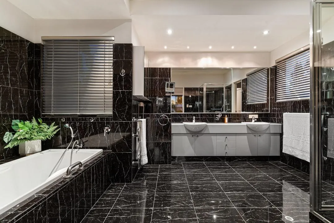 Custom glass showers, vanity upgrades, and modern floor-to-ceiling tiling.